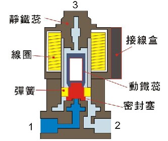 當(dāng)電磁閥線圈斷電時,接口2與接口1關(guān)閉,1通向3;